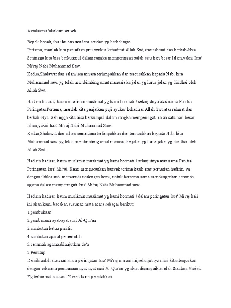 By cuitandokter on nov 30, 2020. Mulai dari salam pembuka, mukadimah, dan dalil pada program yang sesuai. Mulai dari salam pembuka, mukadimah, dan dalil pada acara yang sesuai. citation needed both were young boys at the time of muhammad's journey of mi'raj. Naskah mc ini spesial dari taman baca virtual karena berupa teks, sehingga bisa & mudah dicopy paste ke ms. Kami dari irmas ( ikatan remaja masjid ) menyampaikan terima kasih atas dukungan, do'a & kehadiran bapak/ibu/saudrai/i dalam acara peringatan isra' mi'raj nabi muhammad saw 1437 h. The events of isra and miʿraj mentioned briefly in the quran are further enlarged and interpreted within the supplement to the quran, the literary corpus known as hadith, which contain the reported sayings of muhammad.two of the best hadith sources are by anas ibn malik and ibn ʿabbas. Teks pembawa acara isra mi'raj di masjid. Kumpulan teks pembawa acara rapat masjid terbaru dan terbaik. Isra mikraj terjadi pada periode akhir kenabian di makkah sebelum rasulullah hijrah ke madinah. Qolallahu taala fil quranil karim audzubillahiminasyaitonirrojim. Isra' mi'raj nabi muhammad ﷺ assalamu'alaikum warahmatullahi wabarokatuh alhamdulillah, alhamdulillahilladzi an'amana 'ala dinil islam wal iman, asyhadualla ilahaillallah wa asyhaduanna muhammadarrosululloh, allahumma sholli 'ala sayidina muhammad wa'ala alihi wasohbihi ajmain, amma ba'du. Qolallahu ta'ala fil qur'anil karim, audzubillahiminasyaitonirrojim.